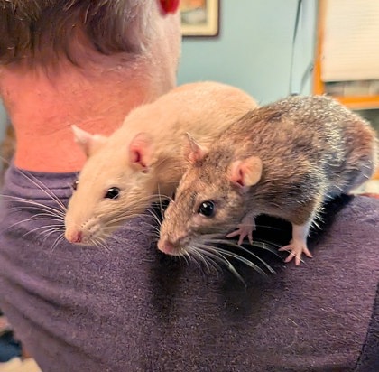 Meet Luna & Terra: Bonded Sisters with Big Hearts and Tiny Feet! These gentle little explorers are ready to steal your heart-and maybe a bite of your breakfast. Luna and Terra are a bonded pair of rats who do everything together, from shoulder rides to snack time. Their sisterly bond is strong, and they must be adopted as a pair to keep their sweet connection thriving. Favorite Treat: Fried eggs (yes, really!). They'll happily skip the pellets if it means sharing a snack with you. Why Rats? Rats are incredibly intelligent, affectionate, and easy to train. They thrive on companionship and love being part of your daily routine. Luna and Terra are no exception-they're gentle, social, and adore human attention. Ideal Home: Someone who appreciates small pets with big personalities.