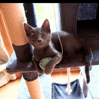 Boing is the happiest kitten his antics give hours of great joy. Then as all kittens do he crawls up on my lap to sleep. He would be a great addition to your home