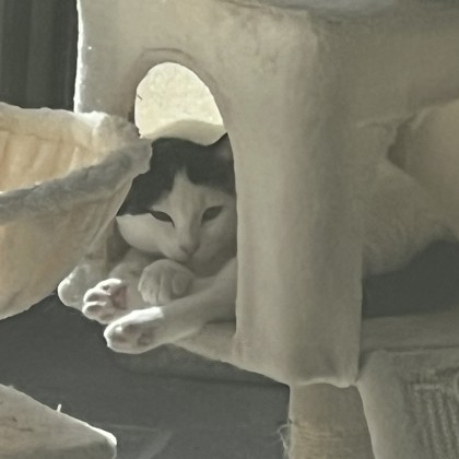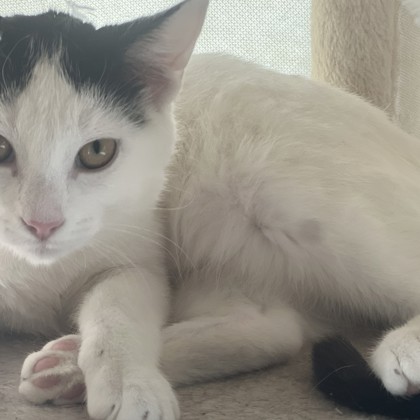 Foster home comments - Sketch is a great kitten and a handsome cuddlebug. Almost completely white with black accents on his head and tail. He has a soothing thick coat that he loves scratched. A little shy at first, but warms up fast and melts into your arms. Likes other cats. Contact the foster at whsadopterjeanine@gmail.com