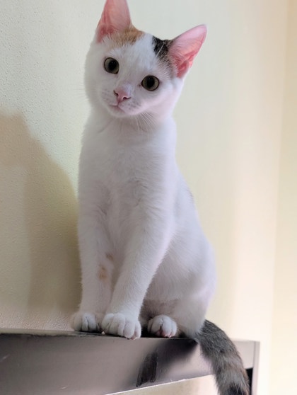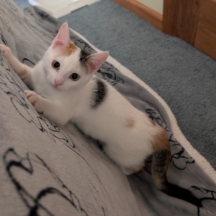 "Linda is a charming little kitten with the cutest chirp you've ever heard-especially when she's chasing her favorite toy. She loves chasing wand toys, flopping over for belly rubs, and following around her brother Lenny. With her soft purrs and sweet nature, Linda is ready to bring love and light to her forever home.