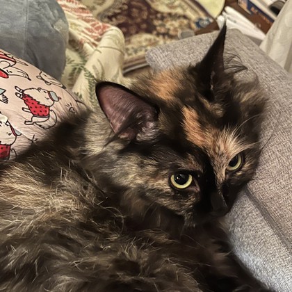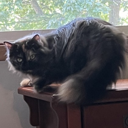 "Beautiful, very loving and playful, loves to cuddle and be petted. She warmed up to us in less than a day and follows my son around. She has slept with him since the second night. In our home she has done well with the litterbox. There are only 2 adults in our home, so we don't know how she would react to other animals or kids."