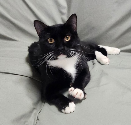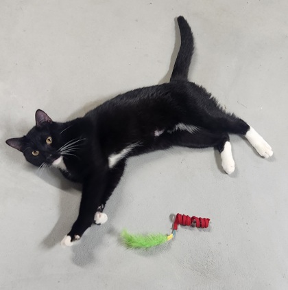 Two year old Black Bear is all ready for Halloween with his tuxedo costume! He is a very friendly and loving cat. You've heard of cats who are 'head-butters?' Well, this cat is a 'hand-butter.' If your hand is anywhere near him, he will nudge it, looking for heads and chin rubs! And his purr motor is going full strong the whole time. The Stick 'O Dynamite cat nip toy and chasing glitter balls are his favorites.