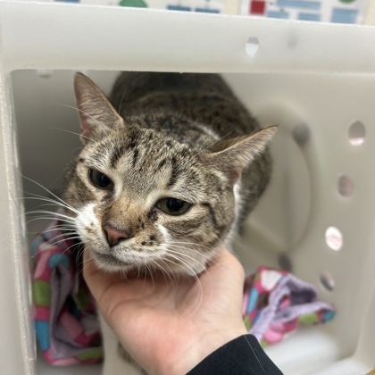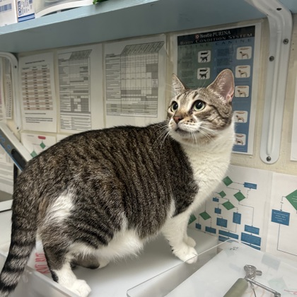 Hello! Meet Bib- Paige's staff pick! He is a super sweet boy that adores any ear scratches or pets that come his way. While he may be snoozing in the back of his kennel at first, he is quite eager to come say hi if you stop by him. He also loves to prowl about his kennel and play. Overall Bib is a sweet little goofball who would make a great buddy!