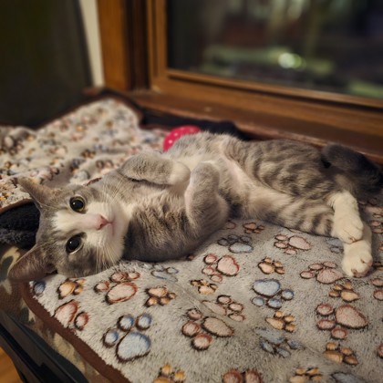 "Sabo is a spunky cat. He loves affection, playing with his toys and to be perched on a windowsill. He has the pinkest nose and toes paired with white "socks" on all four feet. He has the biggest eyes almost cartoon like when he puts his ears back. Sabo is a lovely cat to have in the home."