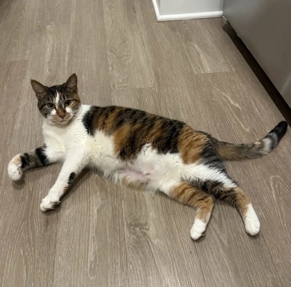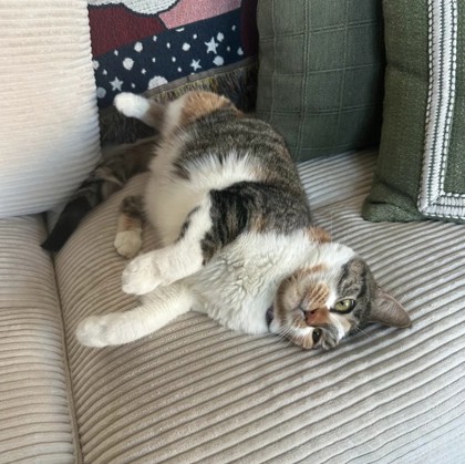 "Mila is a wonderful, content young cat. She does not waste time getting to know you and is a confident explorer of new places. Her demeanor can be described at loving, easygoing, curious, and calm. Her favorite things to do in her foster home are to bird watch and cuddle. Mila is also a sucker for chest and belly rubs. She will let you know she's ready for one by rolling over right next to you. Her foster parent's favorite funny anecdote about her is that she fell asleep during a nail trim, showing off her nonchalant personality."
