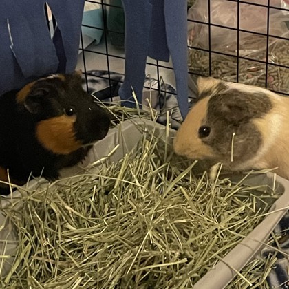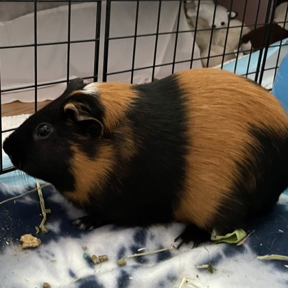Meet Coco, a sweet guinea pig who enjoys hanging out with his guinea pig friend S'mores. He has been getting more and more comfortable with the sounds and routines of our house, and seems to be settling in quite well. Coco enjoys playing chase with his friend S'mores, digging in the hay box for the freshest hay and eating fresh veggies. Coco also likes listening to relaxing music and read aloud stories, and popping around his large enclosure. This pair would be a wonderful addition to a family! Come and meet them! They are required to be adopted together.